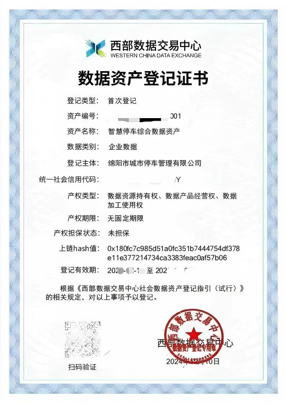 数据资产登记证书 - 智慧停车综合数据资产