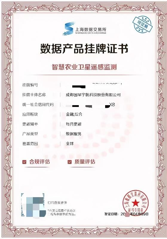 数据产品挂牌证书 - 智慧农业卫星遥感监测