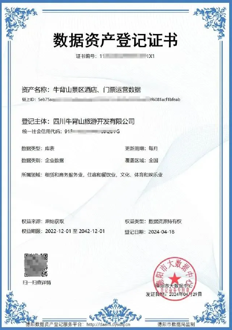 数据资产登记证书 - 牛背山景区酒店、门票运营数据