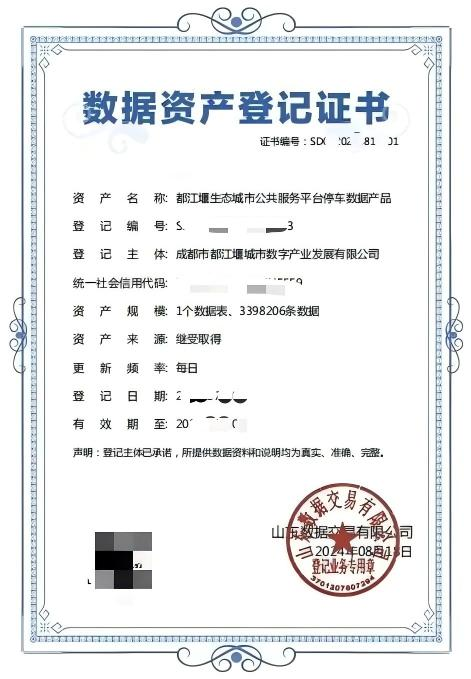 数据资产登记证书 - 都江堰生态城市公共服务平台停...