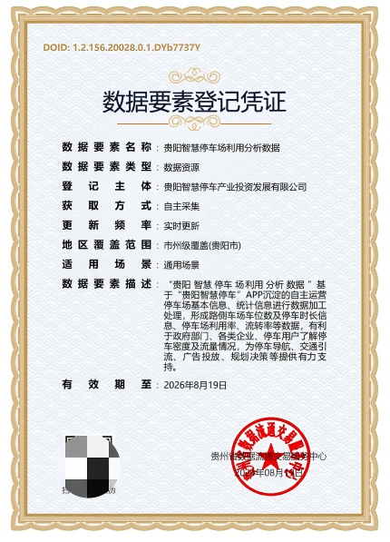 数据要素登记凭证 - 贵阳智慧停车场利用分析数据