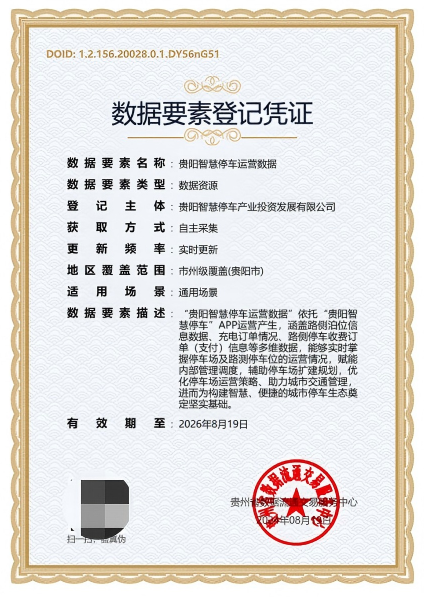 数据要素登记凭证 - 贵阳智慧停车运营数据