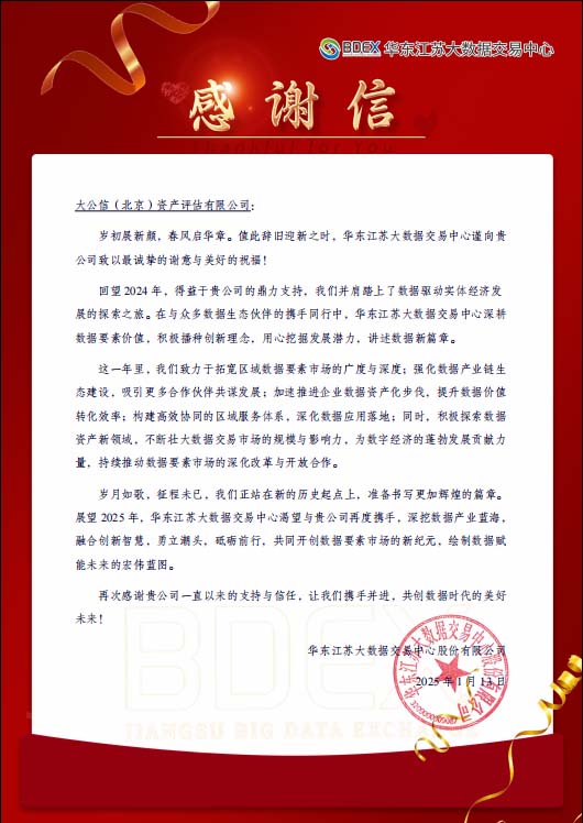 华东江苏大数据交易中心感谢信