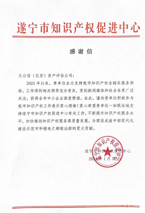 遂宁市知识产权促进中心感谢信