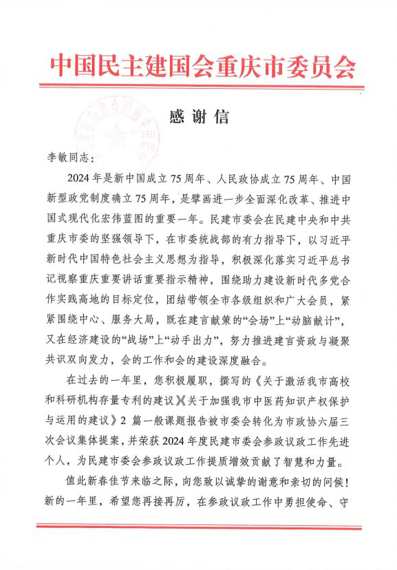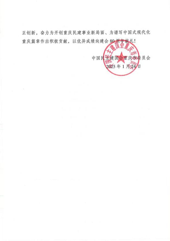 中国民主建国会重庆市委员会感谢信