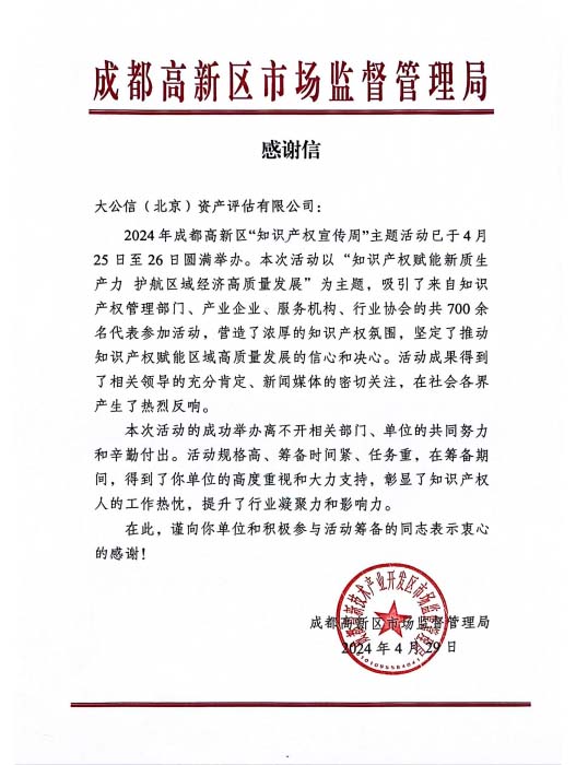 成都高新区市场监督管理局感谢信