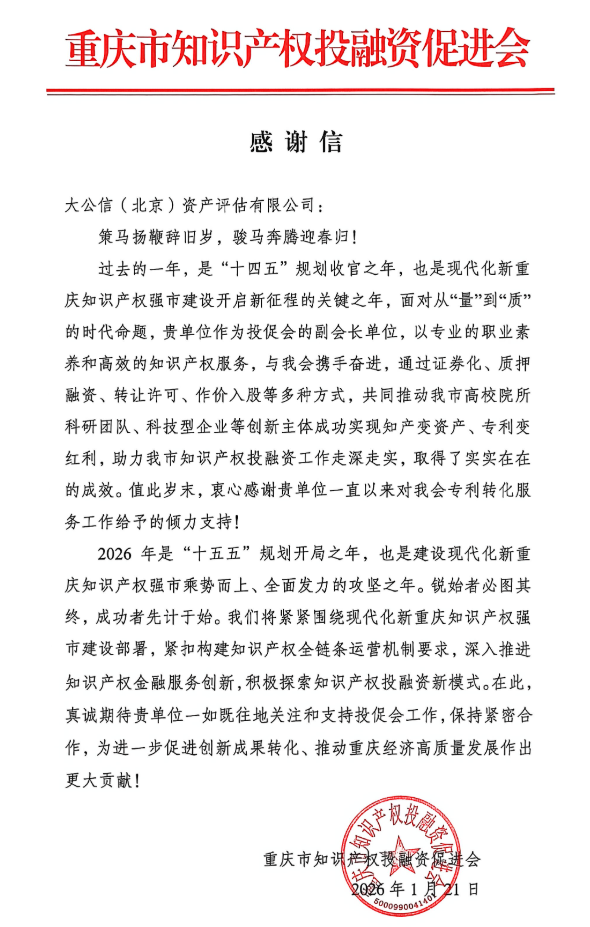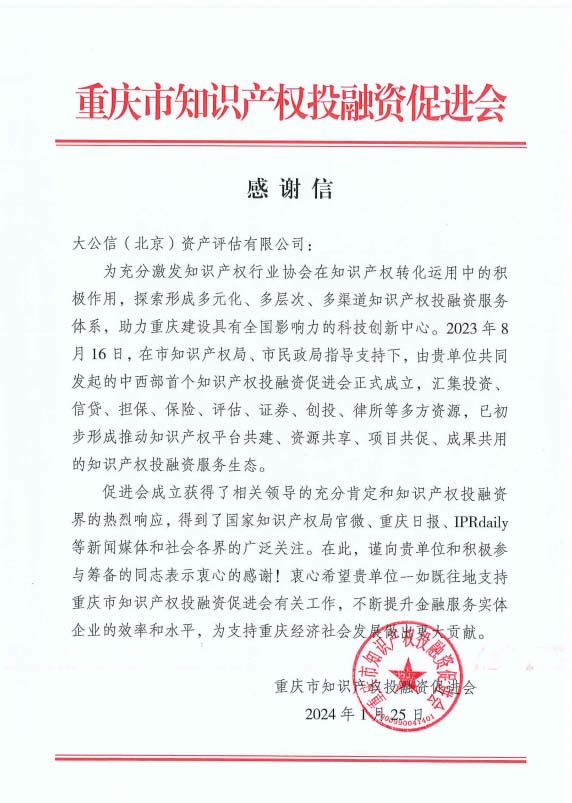重庆市知识产权投融资促进会感谢信