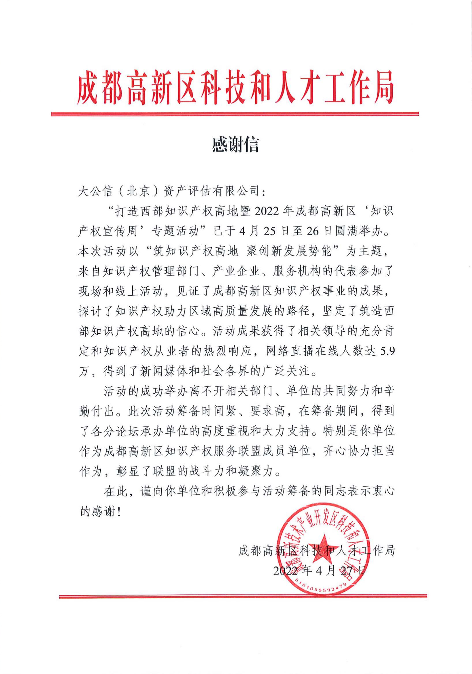 成都高新区科技和人才工作局感谢信