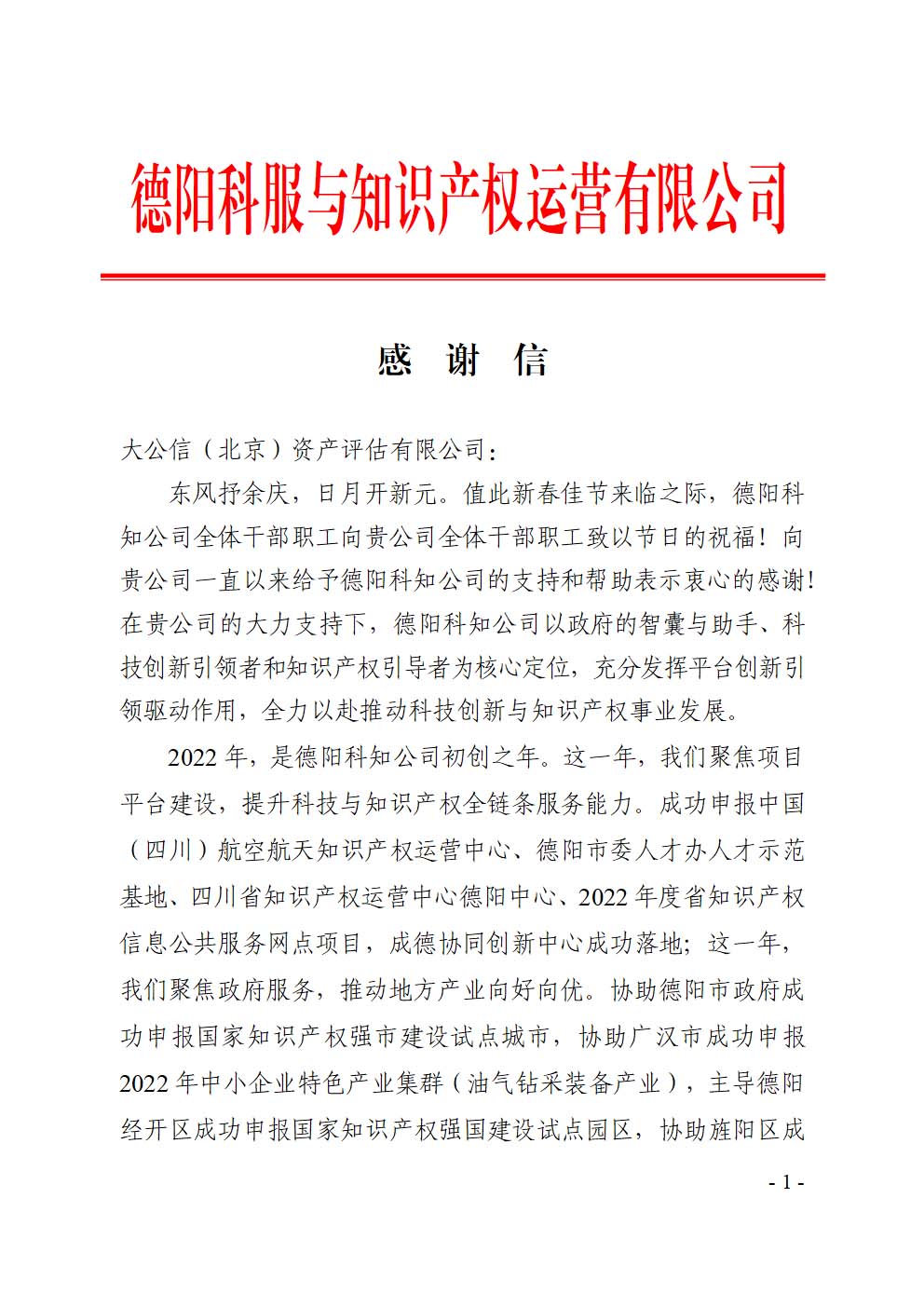 德阳科服与知识产权运营有限公司感谢信