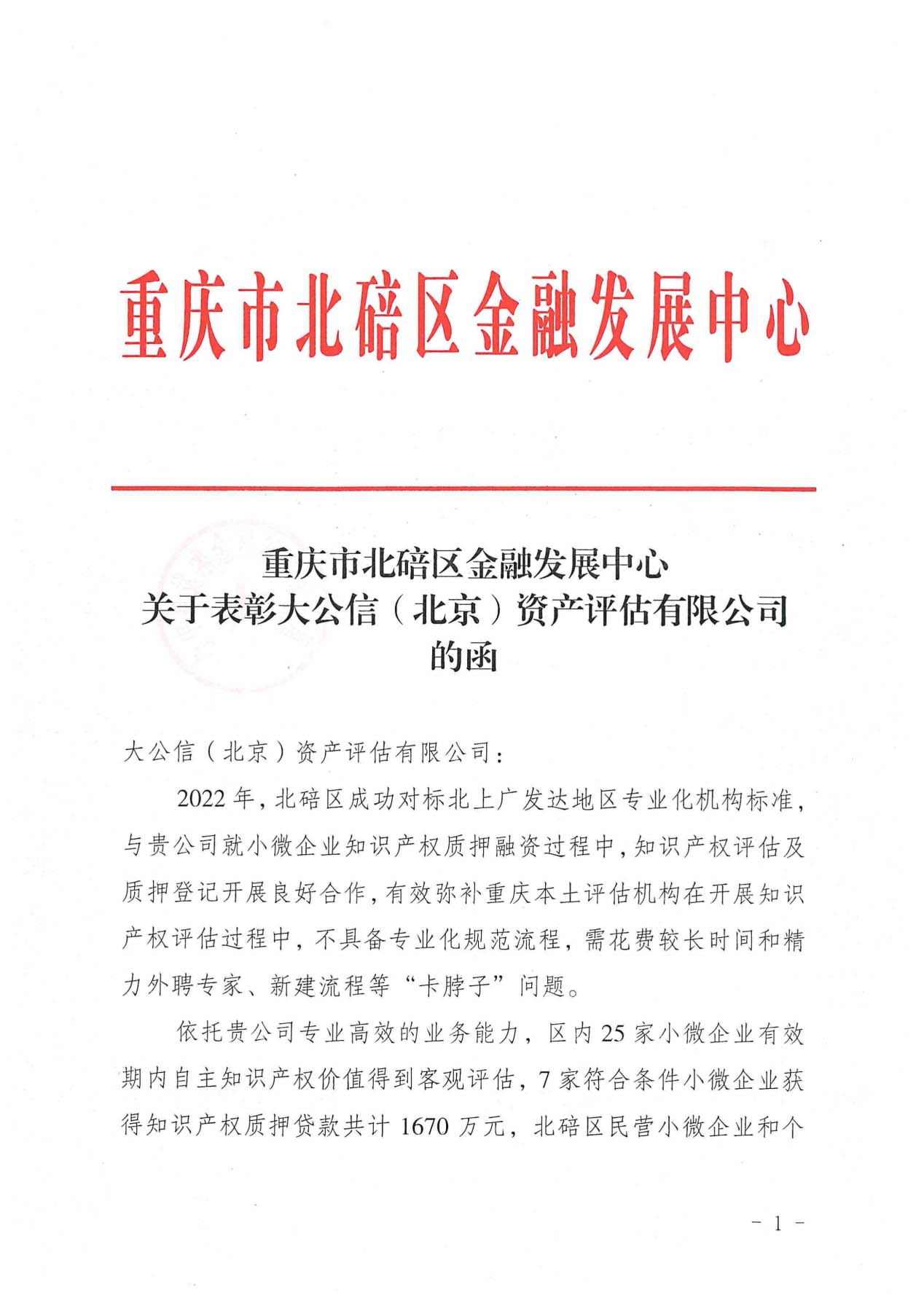 重庆市北碚区金融发展中心感谢信