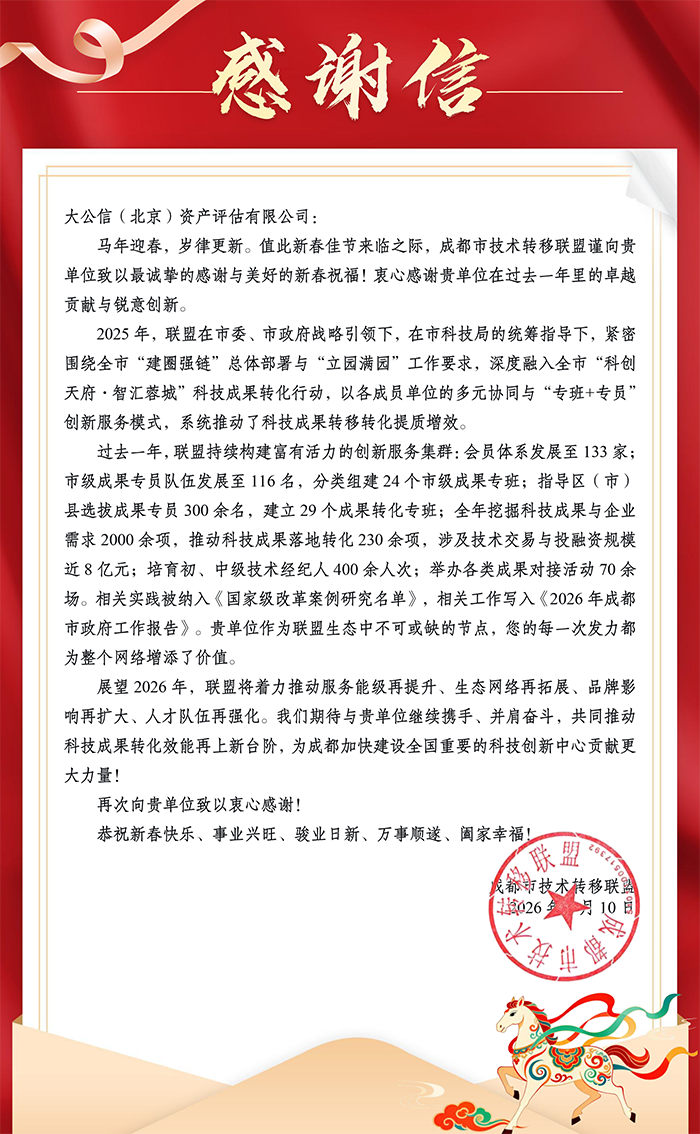 成都市技术转移联盟感谢信