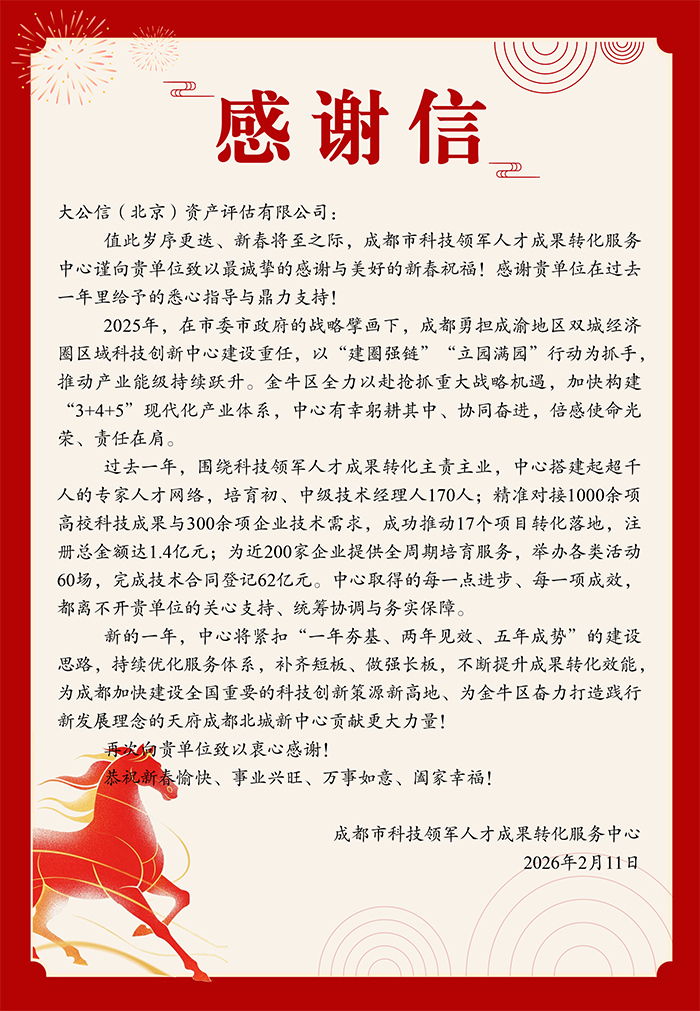 成都市科技领军人才成果转化服务中心感谢信