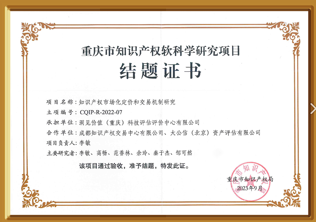 知识产权市场化定价和交易机制研究结题证书